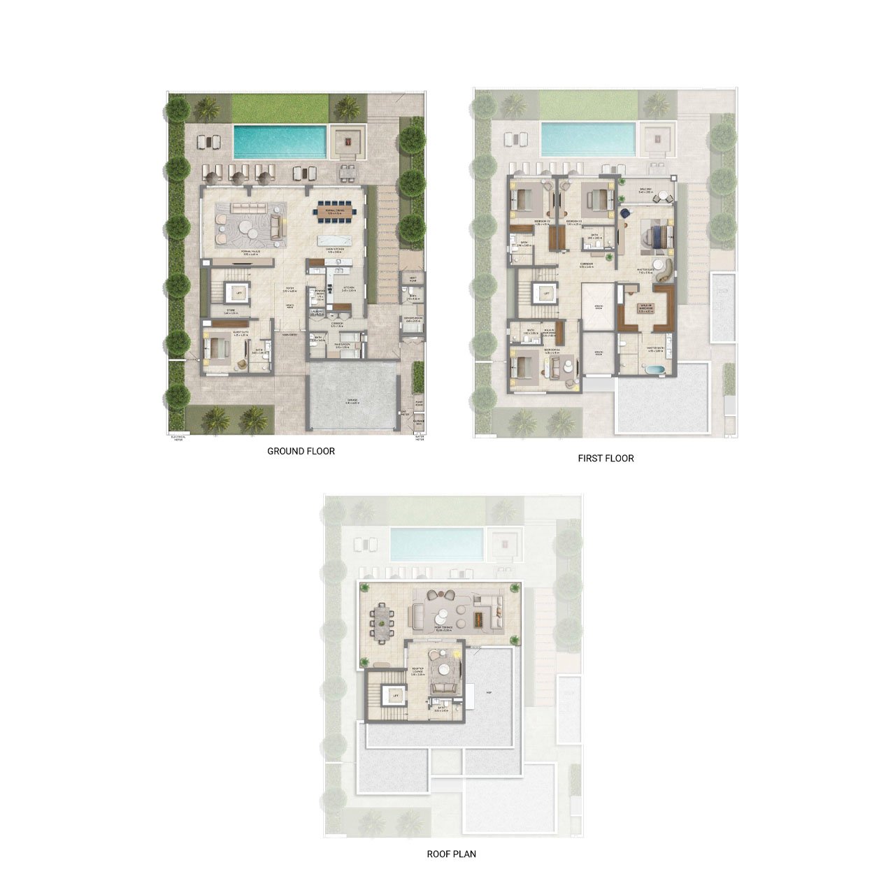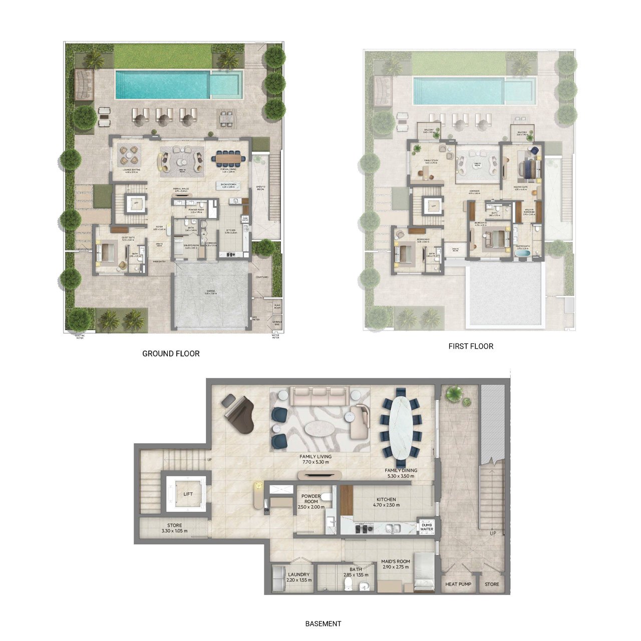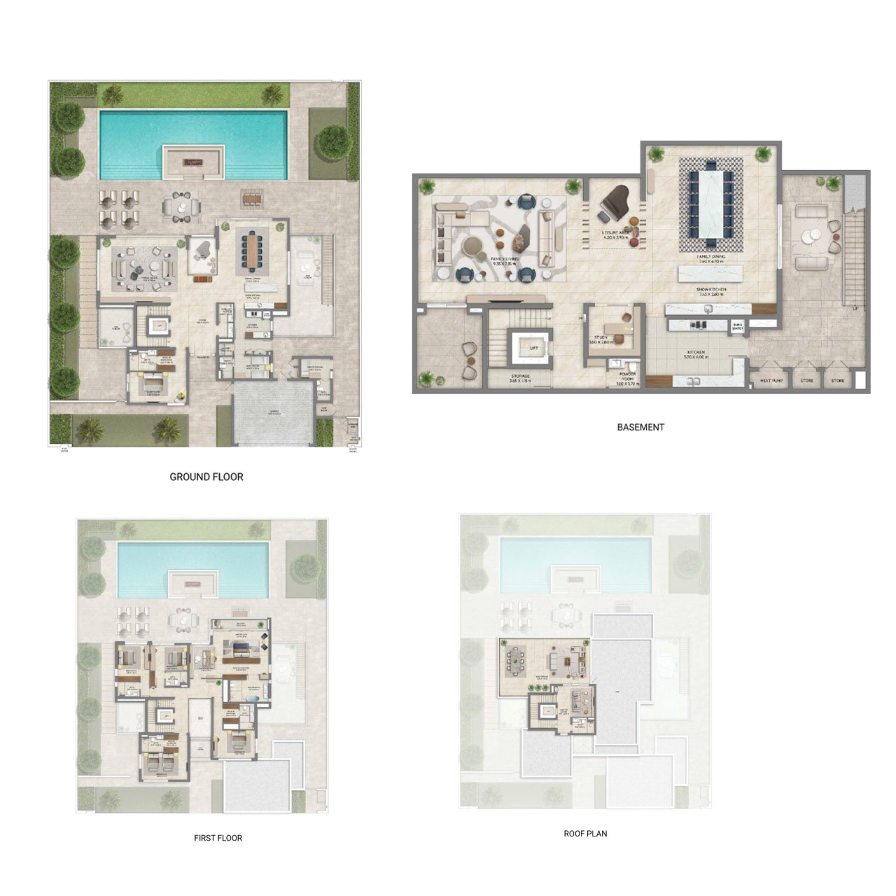 All residences include a swimming pool, driver’s accommodation with private garage access, a fully-equipped prep and show kitchen (premium European appliances), a double-height entryway to the foyer, a formal majlis, a maid’s room, lift access, a ground-floor guest suite, a first-floor main bedroom suite, and spacious secondary suites with en-suites. Properties with a basement have a basement-level kitchen with a dumbwaiter. Rooftop areas comprise an open outdoor space, a lounge, and a bathroom for enhanced convenience.