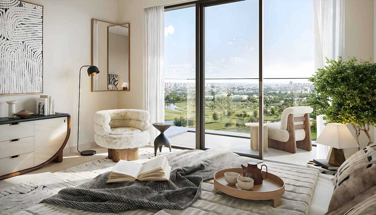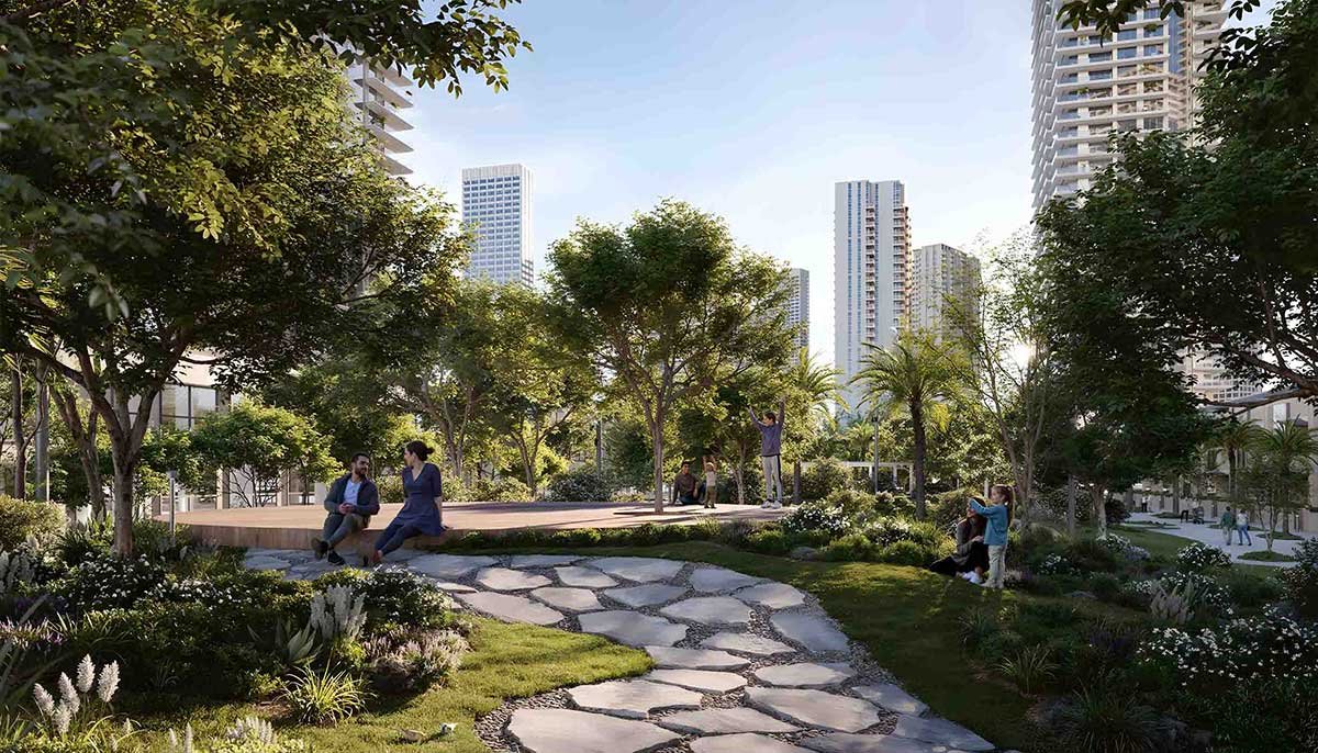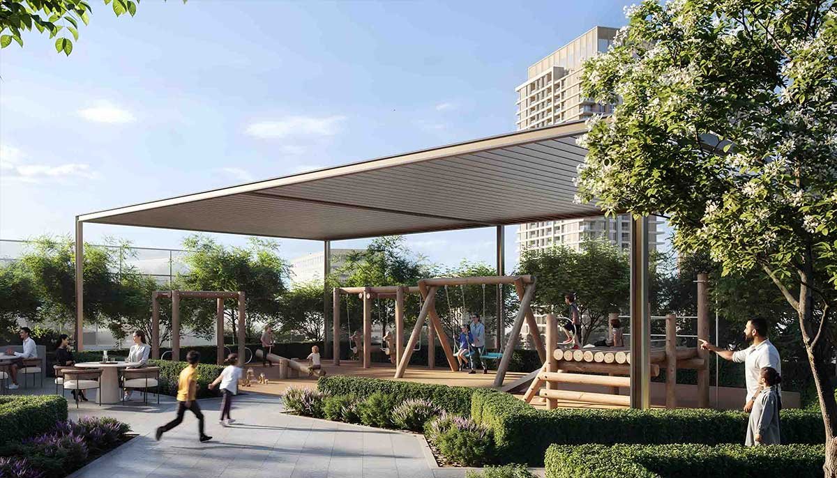 The residential development offers 1–3 bedroom apartments and 3-bedroom park-facing townhouses. Real estate prices start from AED 1.81M (USD 493K). The developer offers an 80/20 payment plan.