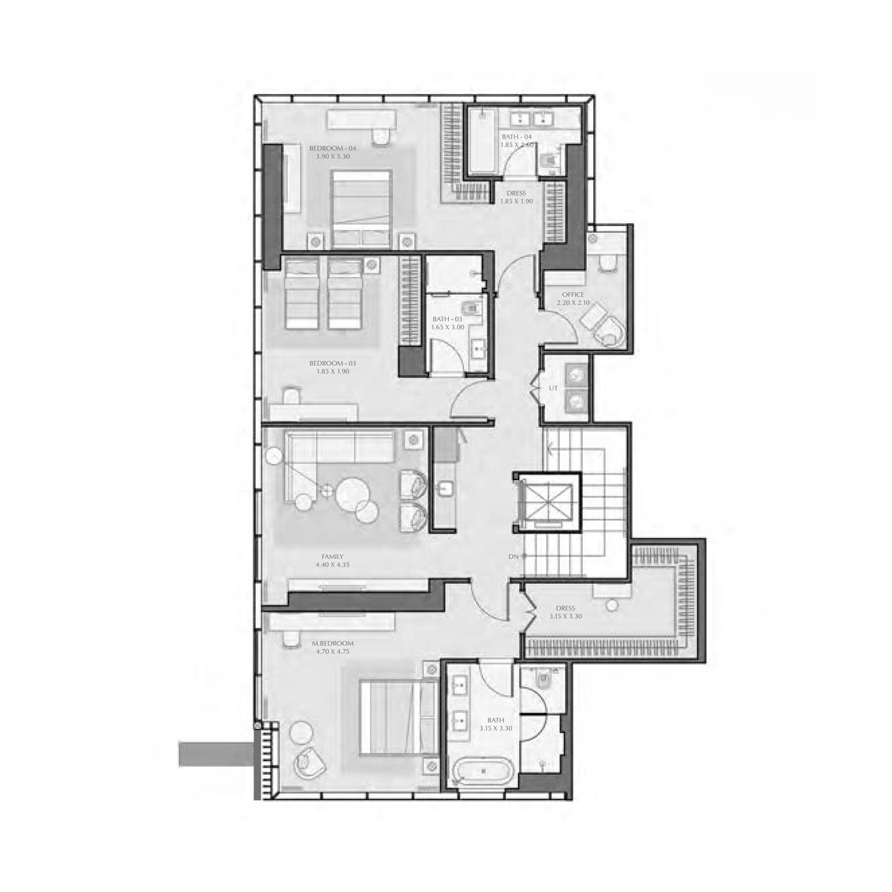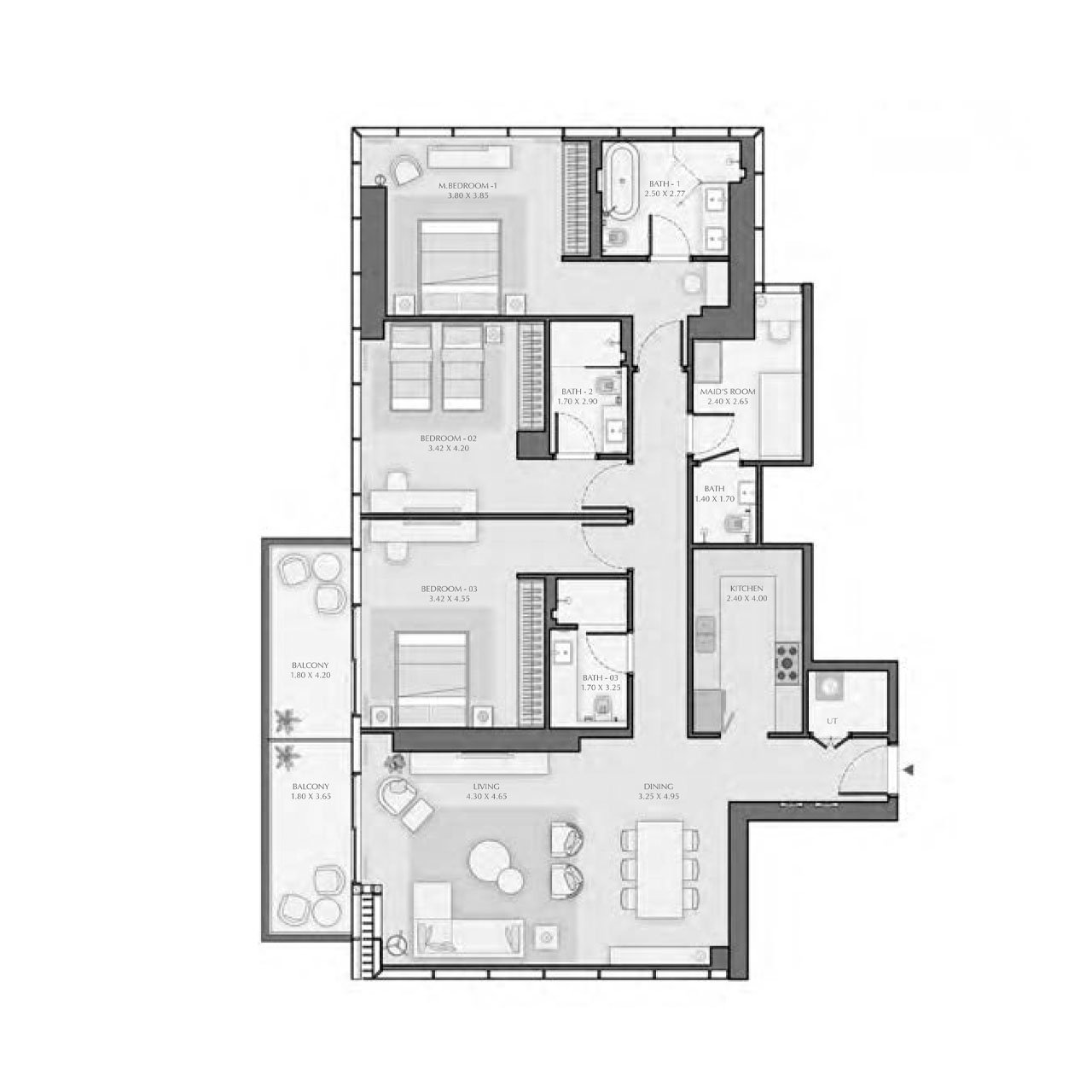 Available for purchase are apartments with 1-3 bedrooms and duplexes with 3-4 bedrooms, ranging in size from 720 sq. ft to 5035 sq. ft. All residences will have balconies with views of the park or surrounding area. The kitchens have household appliances, including a stove and dishwasher. Some 2-3 bedroom apartments and all duplexes also have staff quarters.