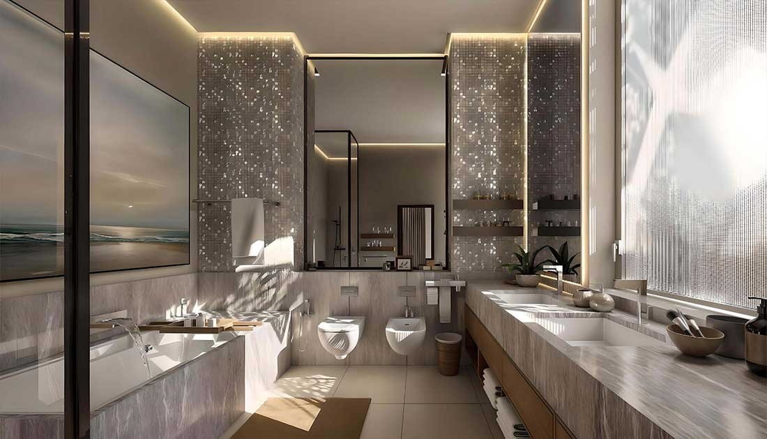 Boasting impressive ceiling heights of up to 15ft, the residences exude a sense of openness. The bathrooms are elegantly finished with mosaic tiles, adding a touch of luxury and shine. Residents of the corner lofts will enjoy breathtaking 270-degree views, enhancing the living experience with panoramic vistas.