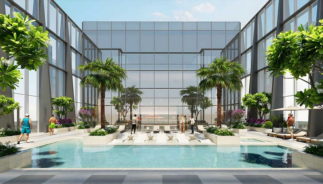 The Element at Sobha One features a gym, clubhouse, swimming pool with lounge area, restaurants, a resort-style rooftop pool with an observation deck, a jacuzzi, padel court, table tennis, a CrossFit area, a BBQ area, a yoga/meditation area, playgrounds, pet-walking areas, walking and cycling paths, a co-working space, a library, cinema, lounge, and a kids’ club.