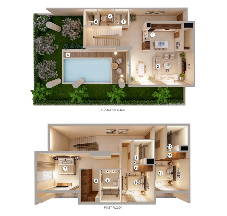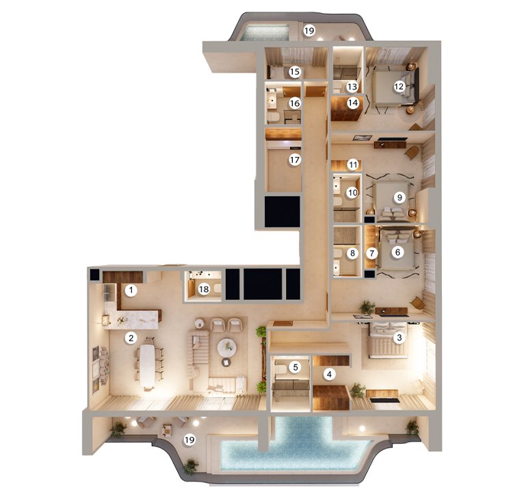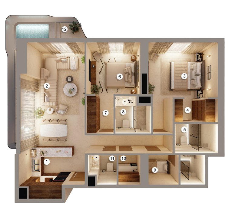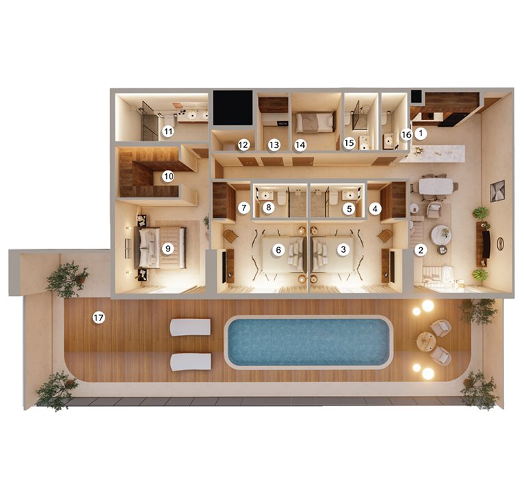 Tivano presents an exclusive collection of 1- to 4-bedroom apartments and 3-bedroom duplexes, meticulously designed and showcasing high-quality finishes. Unit sizes range from 912 sq. ft to 3,694 sq. ft. All residences include a guest bathroom, while 2- to 4-bedroom units feature a maid’s room. Select configurations will offer private pools.