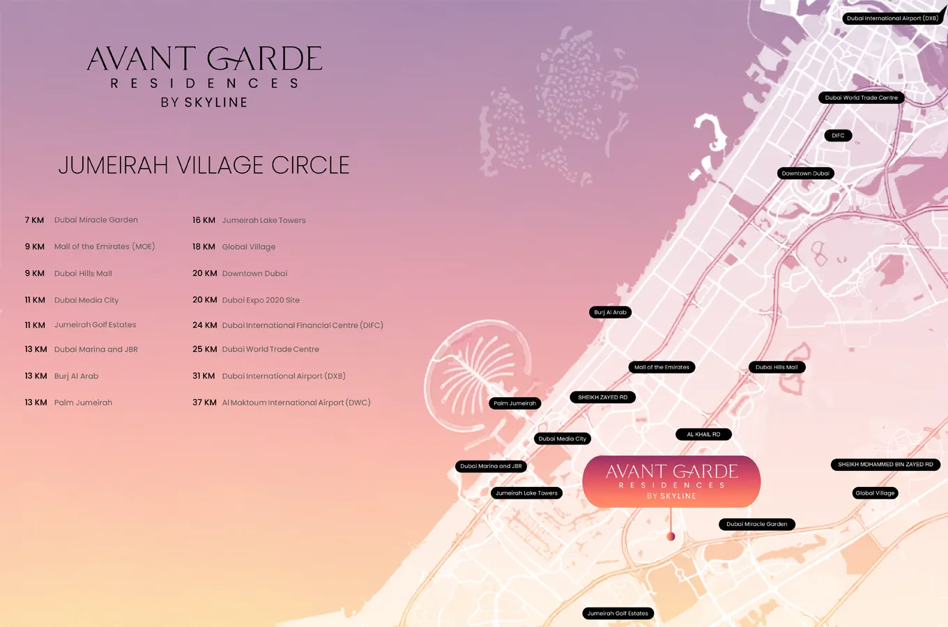 Within the vibrant and independent community of Jumeirah Village Circle, Avant Garde Residences has an excellent position. From this prime location, locals can easily access: