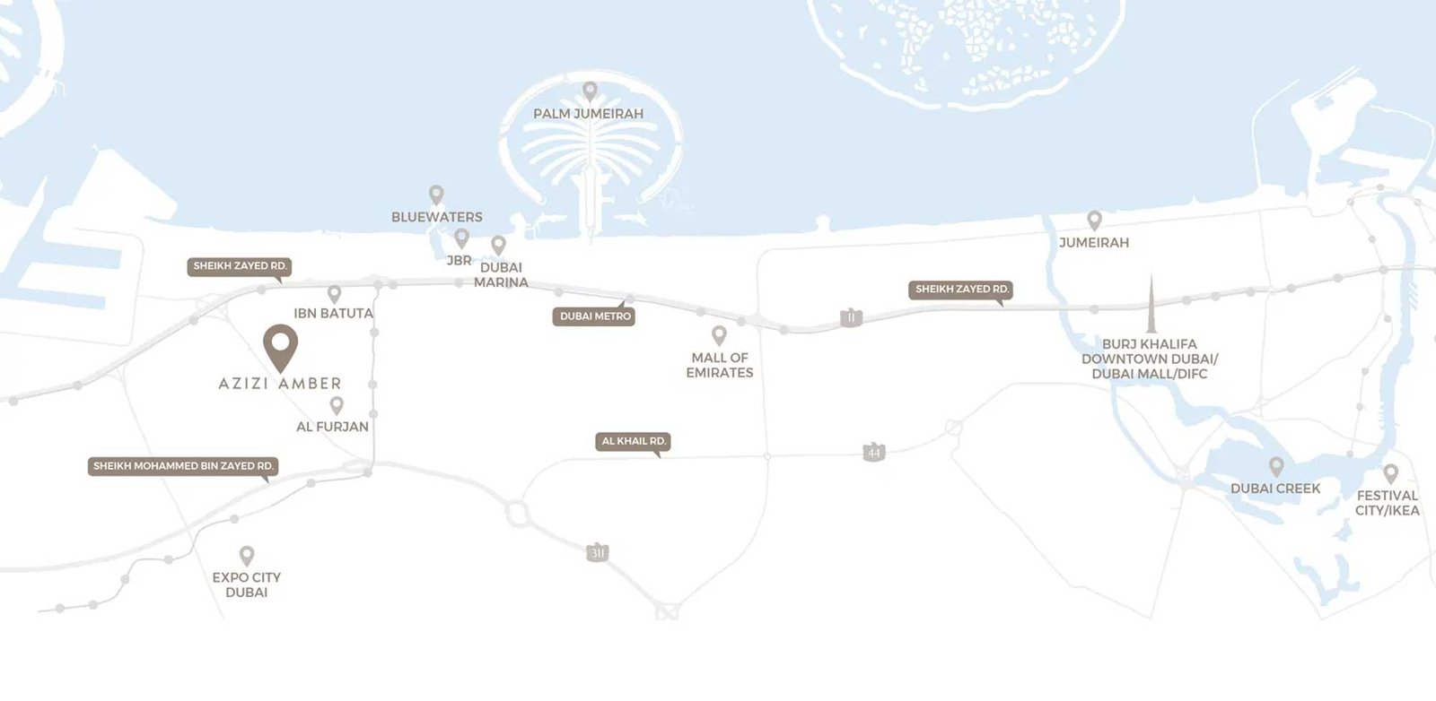 Azizi Amber is located perfectly in the heart of the Al Furjan within Dubai. This locality is famous for its natural lifestyle with modern aspects at work. Where users will have almost everything within their reach via easy access to various places and famous key locations.