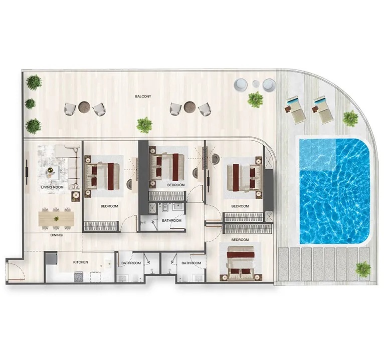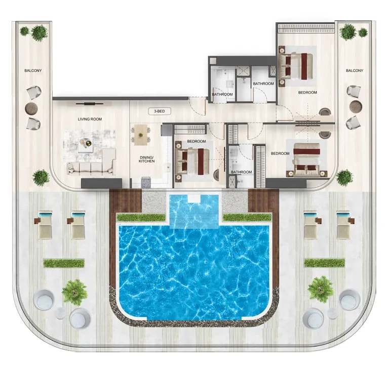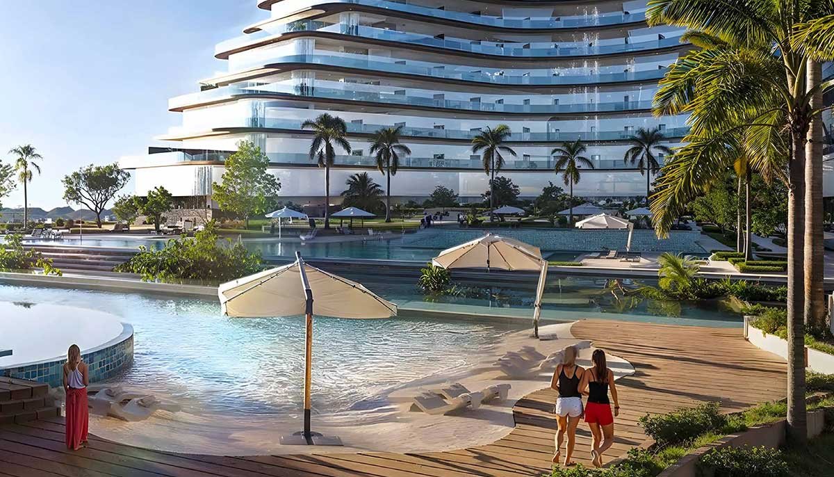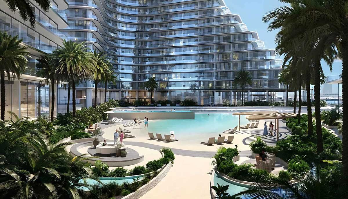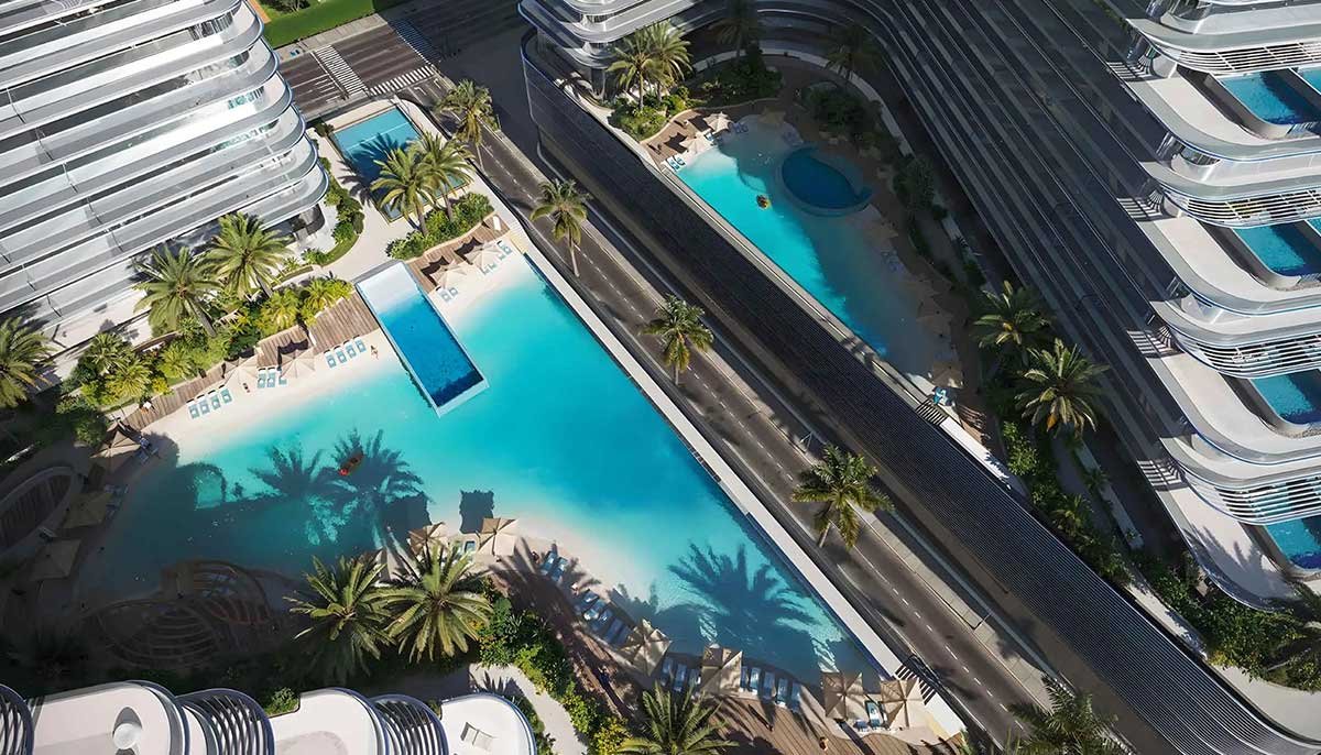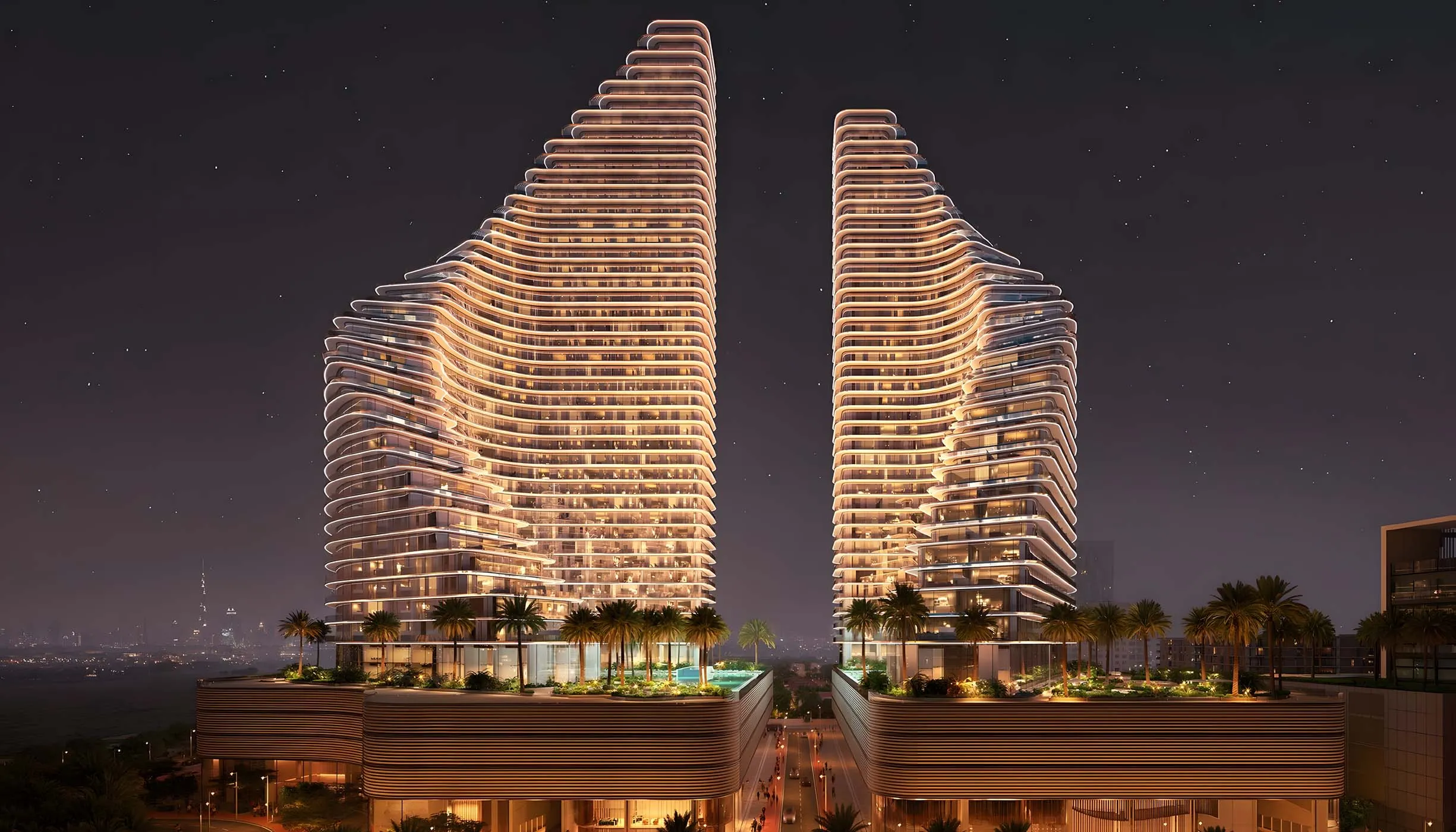 A luminous, sculptural design across twin towers; radial layouts; signature Binghatti architectural language blending symmetry, light, and emotion; private pools for select Sky Terrace units; panoramic views; vibrant podium-level retail; and curated resort-style amenities.
