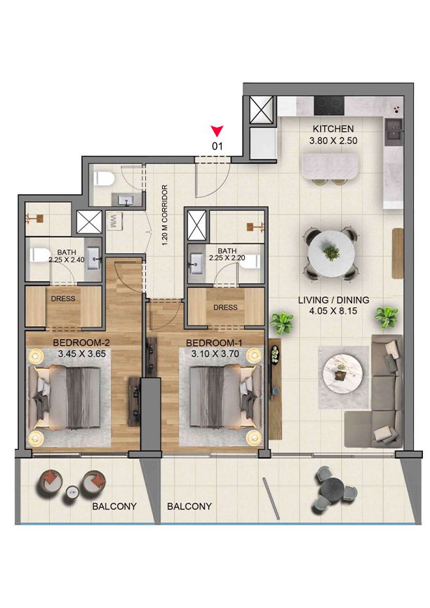 A comprehensive range of amenities across two floors cater to the diverse needs of residents, promoting well-being and social interaction. The 5th floor offers amenities such as an infinity pool (outdoor), a kids’ pool and play area, an indoor and outdoor gym, a sunbed water area, barbeque zones, a jogging track, a yoga room, a sauna, an open-air cinema, treatment rooms, and an outdoor shower. The 24th floor offers amenities such as a games room, lounge area, communal area, exhibition kitchen, closed pantry, billiards tables, foldable tables, and a theatre area.