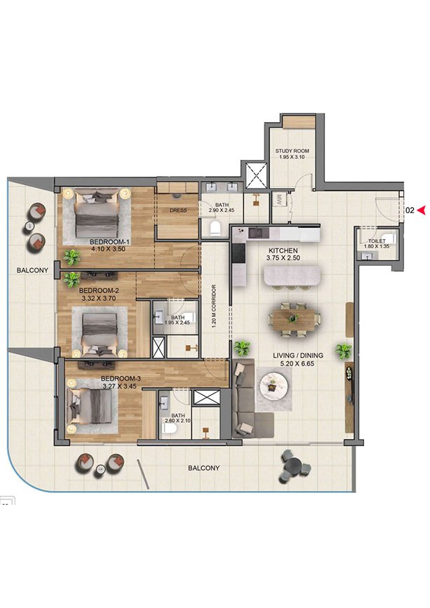 - 3-bedroom apartment: Up to 2,193 sq. ft, including a dedicated study.