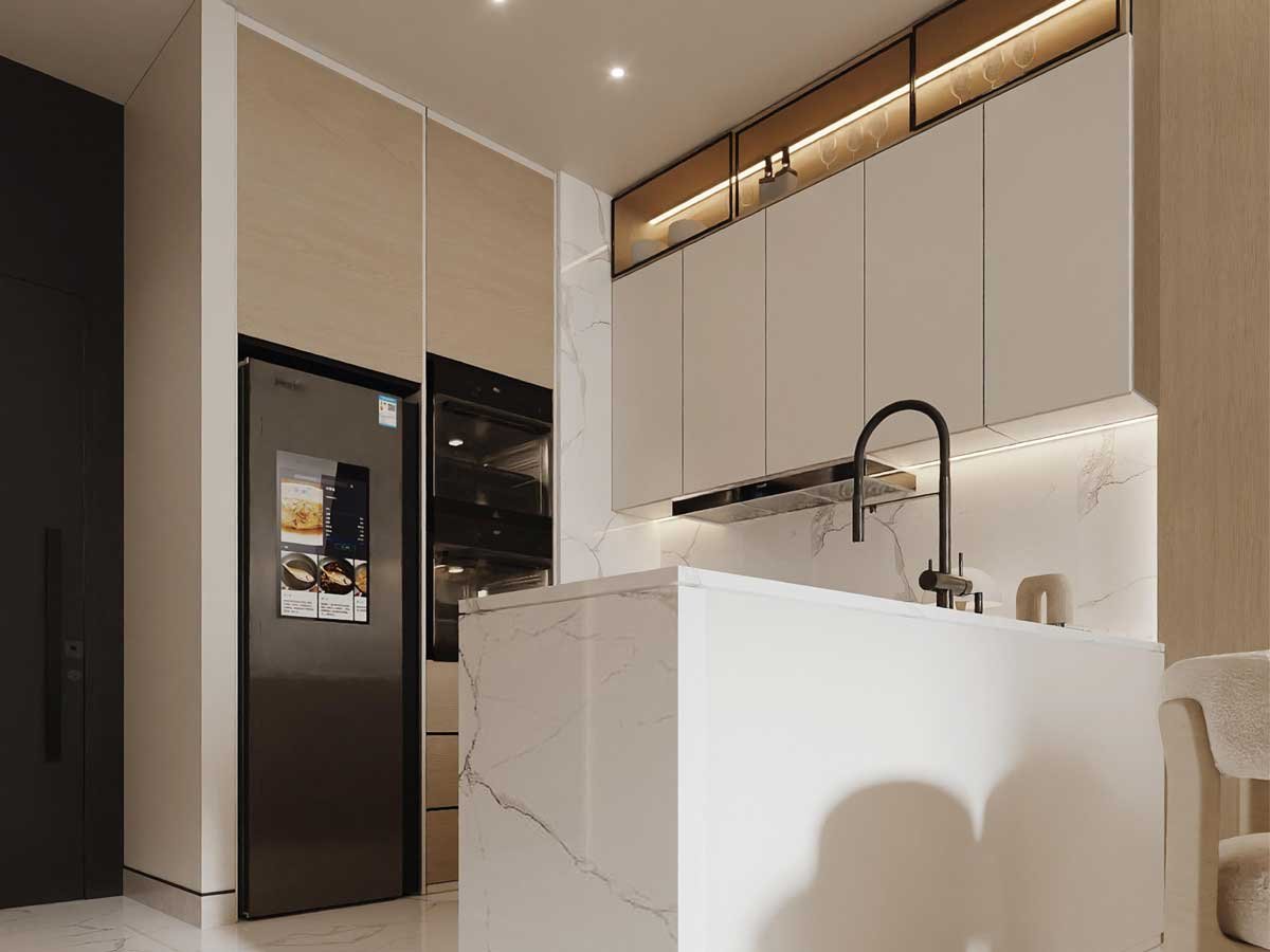 La Crystal offers complete homes with high-end amenities on the podium and rooftop, along with smart home technologies. Each of the 64 units has marble-effect porcelain flooring, custom kitchens, and luxurious finishes throughout.