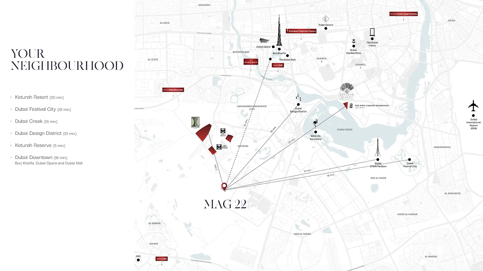 The development offers a range of high-quality amenities for residents to enjoy. These include a large swimming pool, recreation areas, a state-of-the-art health club, retail establishments, restaurants, children’s play areas, BBQ areas, sports facilities, and community parks. MAG 22 ensures a sense of security for its residents, with 24/7 security measures in place. This provides peace of mind and a safe living environment for families. MAG 22 benefits from its strategic location, offering convenient access to major infrastructure facilities. Residents can enjoy easy connectivity to important roads and thoroughfares, such as Sheikh Mohammed bin Zayed Road and Barsha Heights. MAG 22 is a gated community, providing an added layer of privacy and exclusivity for residents. This creates a sense of community while ensuring a secure living environment.