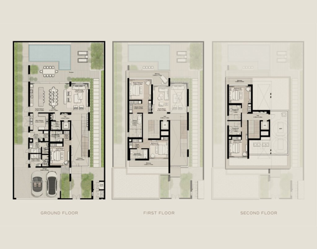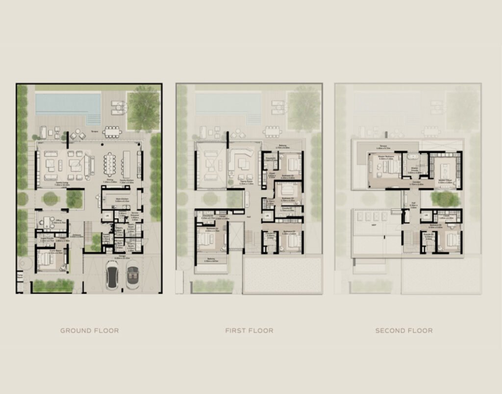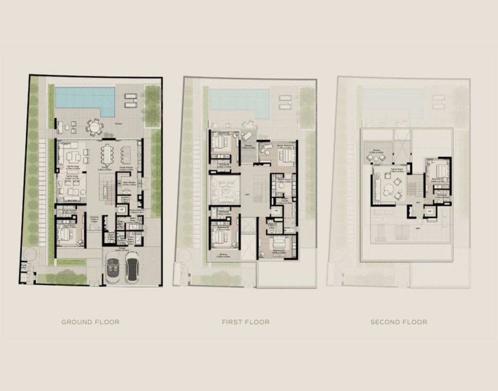 In Q4 2024, Meraas presented the final seventh phase of the premium project. You can buy townhouses with 3 bedrooms and villas with 4–7 bedrooms. The total area of the property ranges from 2,702 sq. ft up to 8,708 sq. ft, and plots — from 2,002 sq. ft. Townhouses will have two floors, and villas with three storeys. Depending on the configuration, some types of real estate will have an elevator, rooms for staff and a driver.