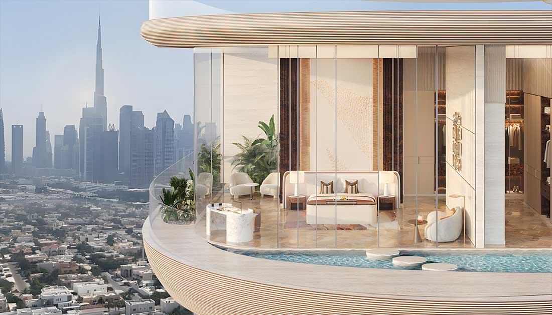 The project offers spacious residences with 3-6 bedrooms, including Sky Villas (3-5 bedrooms), Sky Mansions, and Sky Palaces. Sizes range from 5088 sq. ft. to an expansive 29,700 sq. ft. Each residence boasts a private swimming pool and Jacuzzi, and elevators that provide direct access to the living room.