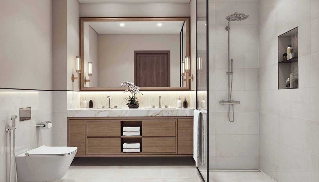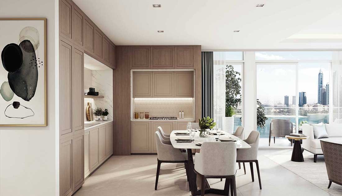 Apartments in Palace Beach Residence are delivered furnished, with built-in wardrobes and facilitated bathroom and kitchen. Open-plan living areas are enlarged with entertainer balconies for seamless indoor-outdoor living. In addition, the layouts feature separate laundry area and spacious bedrooms with floor-to-ceiling windows. The Art Deco style interiors perfectly reflect sea surroundings.