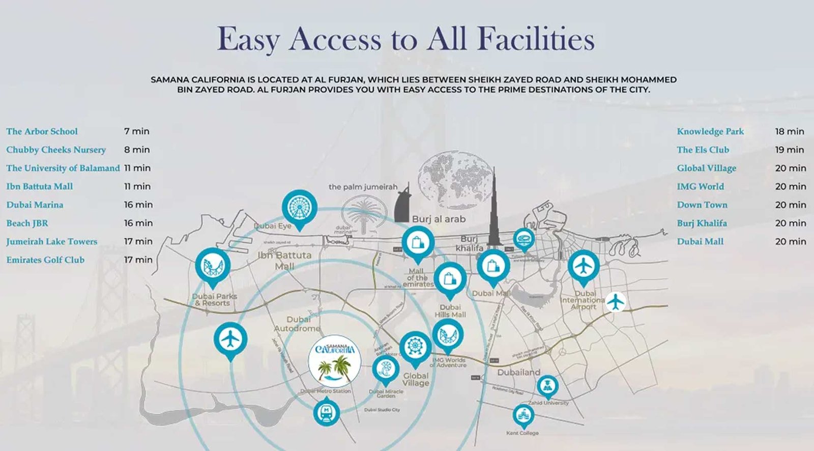 SAMANA California is located in Discovery Gardens, close to Sheikh Zayed Road and Emirates Road. Everyday living is made easier at SAMANA California with easy access to extensive amenities for you. From well-known monuments to schools and healthcare services, this property simply links you to everything.