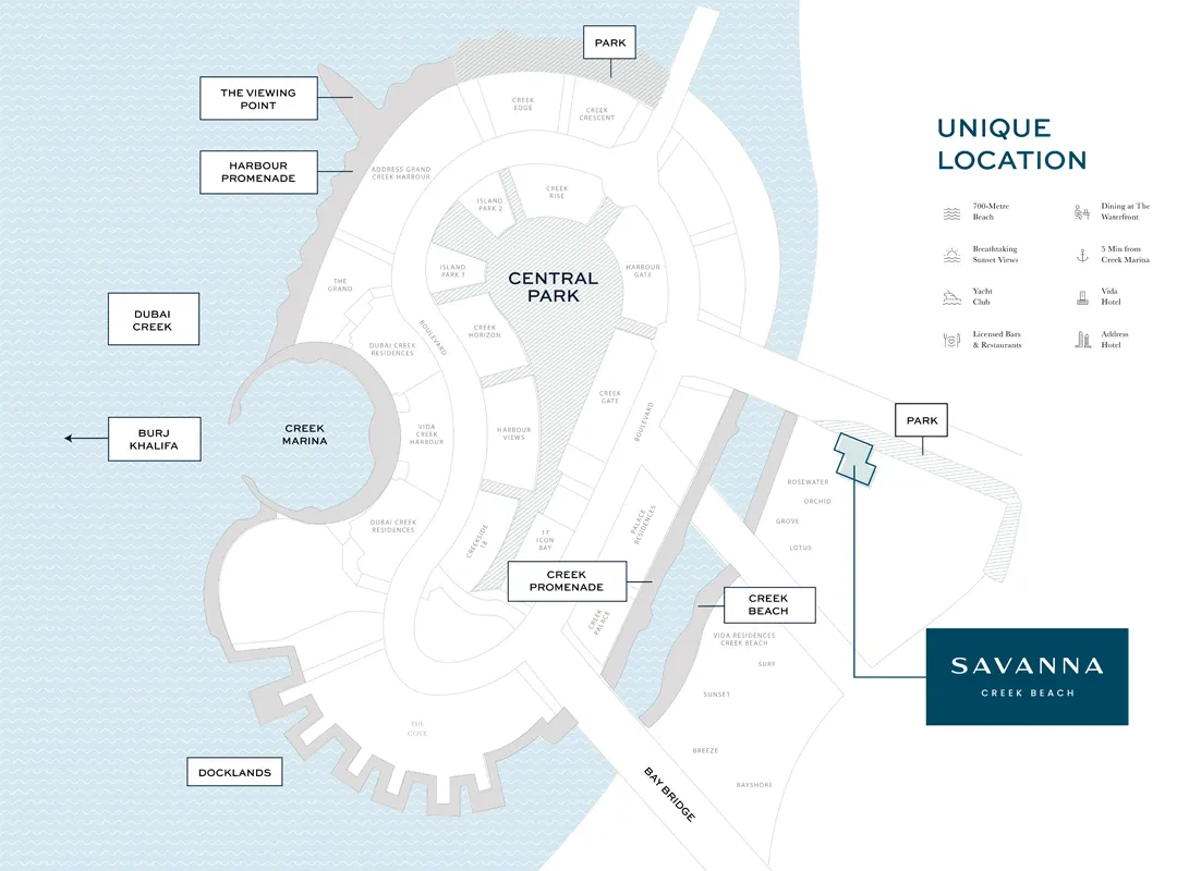 One of the most noticeable aspects of Savanna is its fantastic position on Creek Beach in Dubai. This unique setting provides unprecedented access to some of the city’s most sought-after destinations, including:
