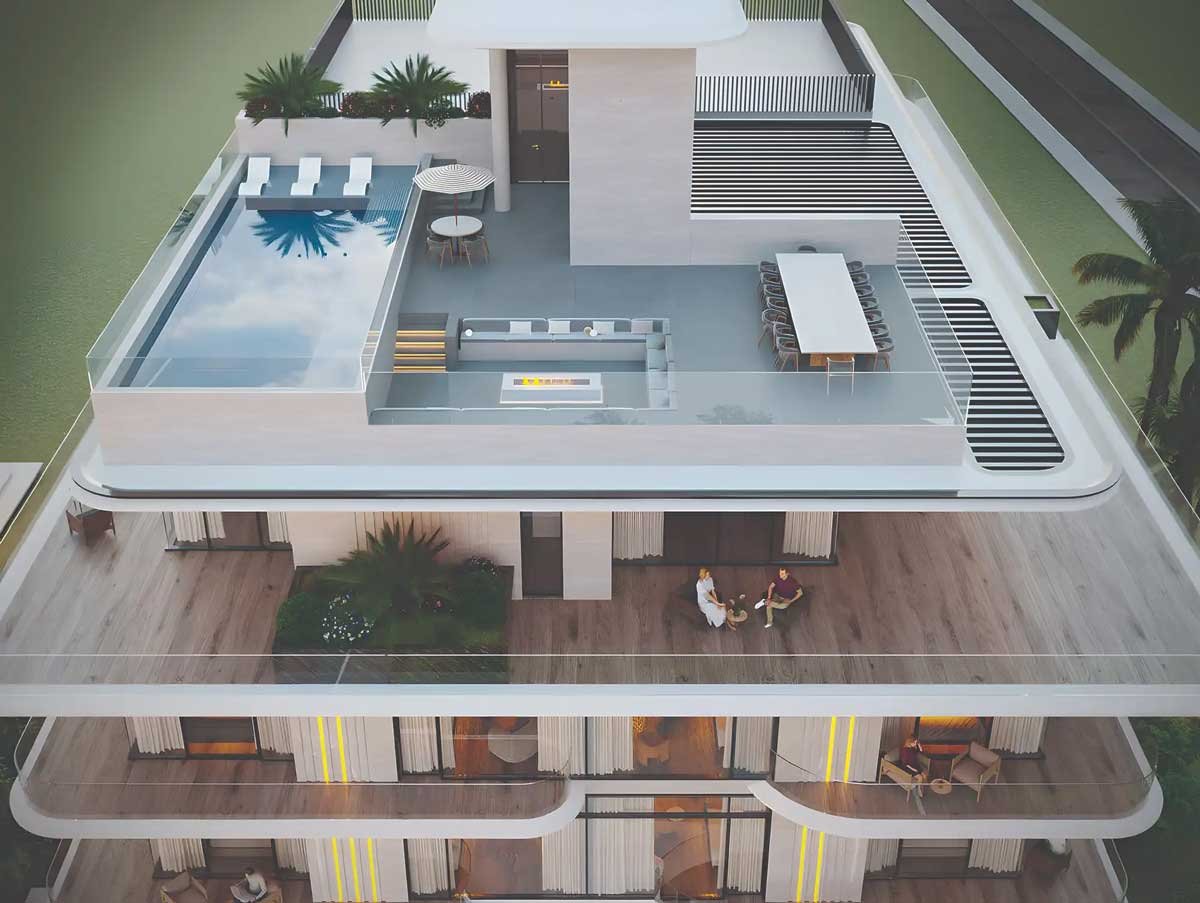 The infrastructure at Sukoon by Nuri includes a rooftop leisure area with an infinity pool, bar and lounge. In addition, the courtyard features a picturesque landscaped garden and a barbecue area.