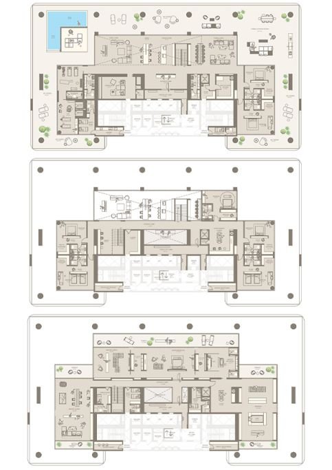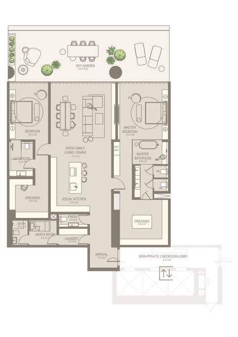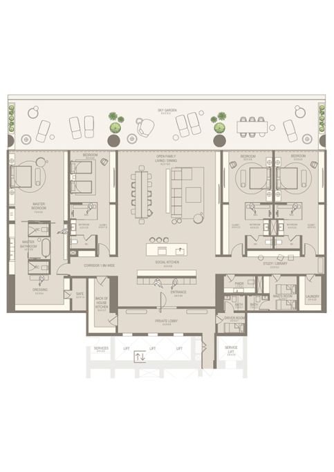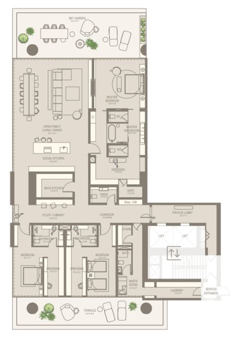 All residences include a laundry room, dressing room, and staff room. From the terraces, you can take in breathtaking views of Burj Al Arab, Palm Jumeirah, or the golf course. The 4-, 6-, and 8-bedroom properties also feature a driver’s room. Duplex villas offer a private swimming pool, barbecue area, library, and nanny room, while the mansions elevate luxury living with a gym, spa, sauna, steam room, and cinema.