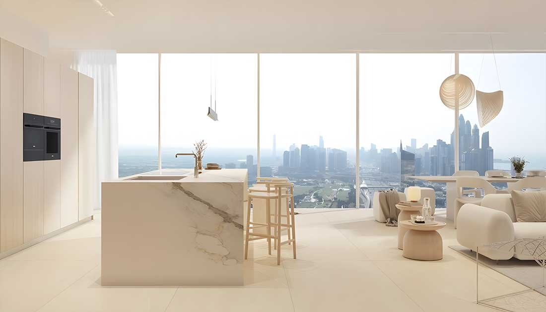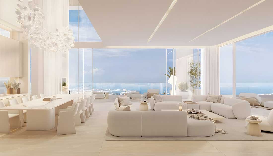 The collection includes branded villas with 2 to 4 bedrooms, duplex villas with 5 bedrooms, The Sky Mansion with 6 bedrooms, and The Pinnacle Mansion with 8 bedrooms. Residences range from 3556 sq. ft. to 33,246 sq. ft. and offer expansive living spaces. Bathrooms feature smart mirrors and premium fittings from Kohler and Hansgrohe, while kitchens by Italian designer Pedini come equipped with state-of-the-art Miele appliances.
