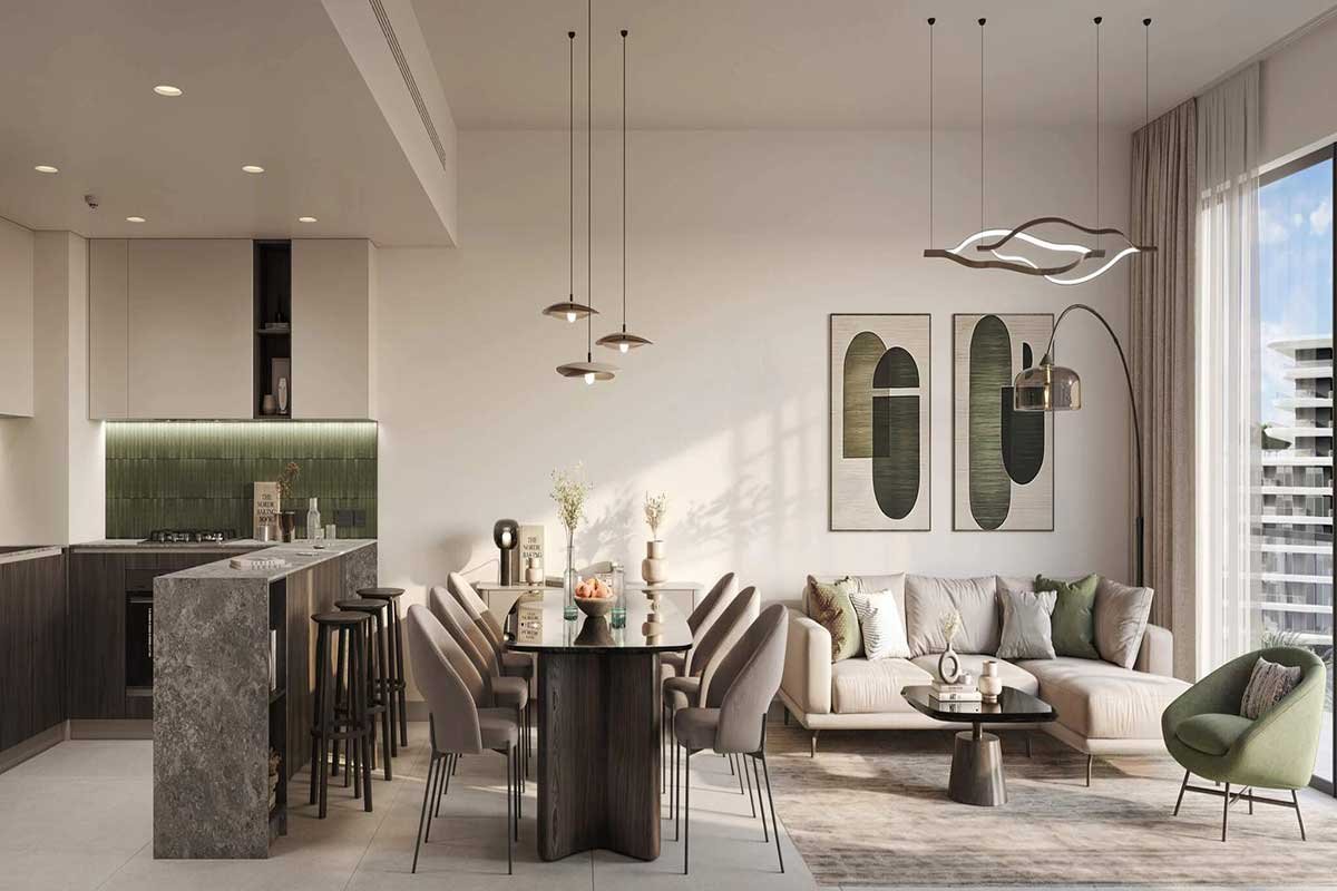 Six mid-rise buildings (G+10 to G+14) in Dubailand’s South Dubai expansion corridor house 740 luxurious apartments in ALDAR’s nature-led community, The Wilds Residences. The property offers 1-3BR apartments and duplexes from AED 1.6M, with sizes ranging from 893 to 2,842 square feet, about 25 minutes from Dubai Mall and DXB Airport. It combines environmental design, wellness-focused features, and family-friendly layouts.