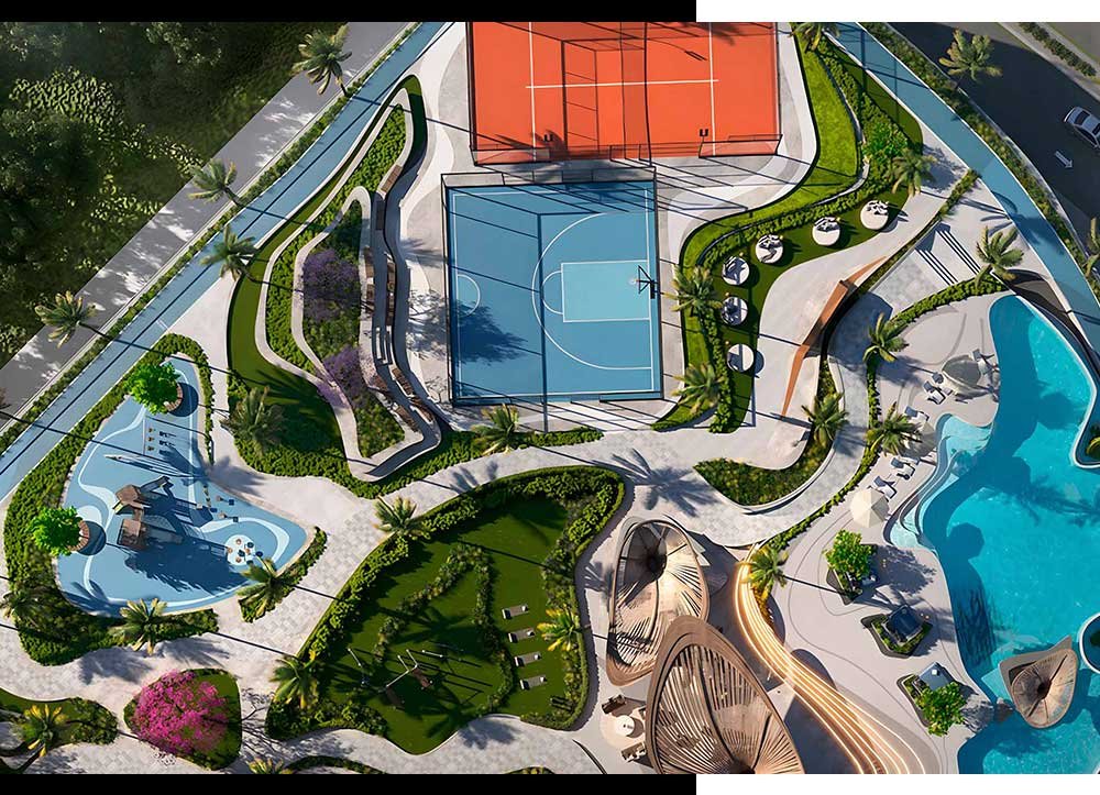 One of the highlights of Velos Residence is its 33rd‑floor rooftop spanning over 120,000 sq. ft, featuring a breathtaking infinity pool and wooden lounge deck, tranquil Japanese and Mediterranean‑style gardens, and a serene meditation & yoga pavilion, perfect for relaxation. Wellness is prioritised with both indoor and outdoor gyms, a yoga studio, and dedicated wellness zones. For entertainment, residents can enjoy an outdoor cinema, padel and basketball courts, a pet-friendly area, and jogging tracks woven through landscaped grounds, while families will enjoy the indoor and outdoor children’s play areas. Day-to-day living is enhanced with covered parking, 24/7 security and concierge, and ground-floor retail outlets and cafes.